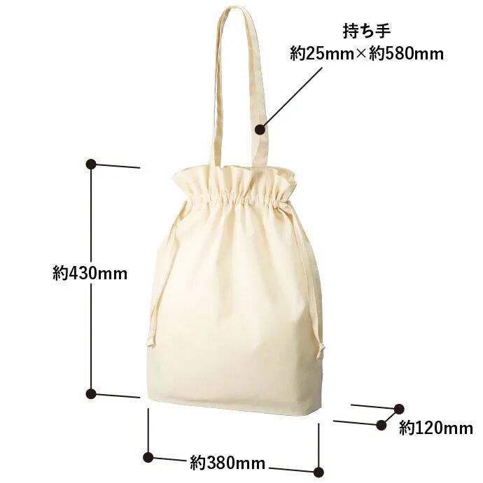 オーガニックコットン生地使用、A4サイズ対応の可愛い巾着タイプのバックです。