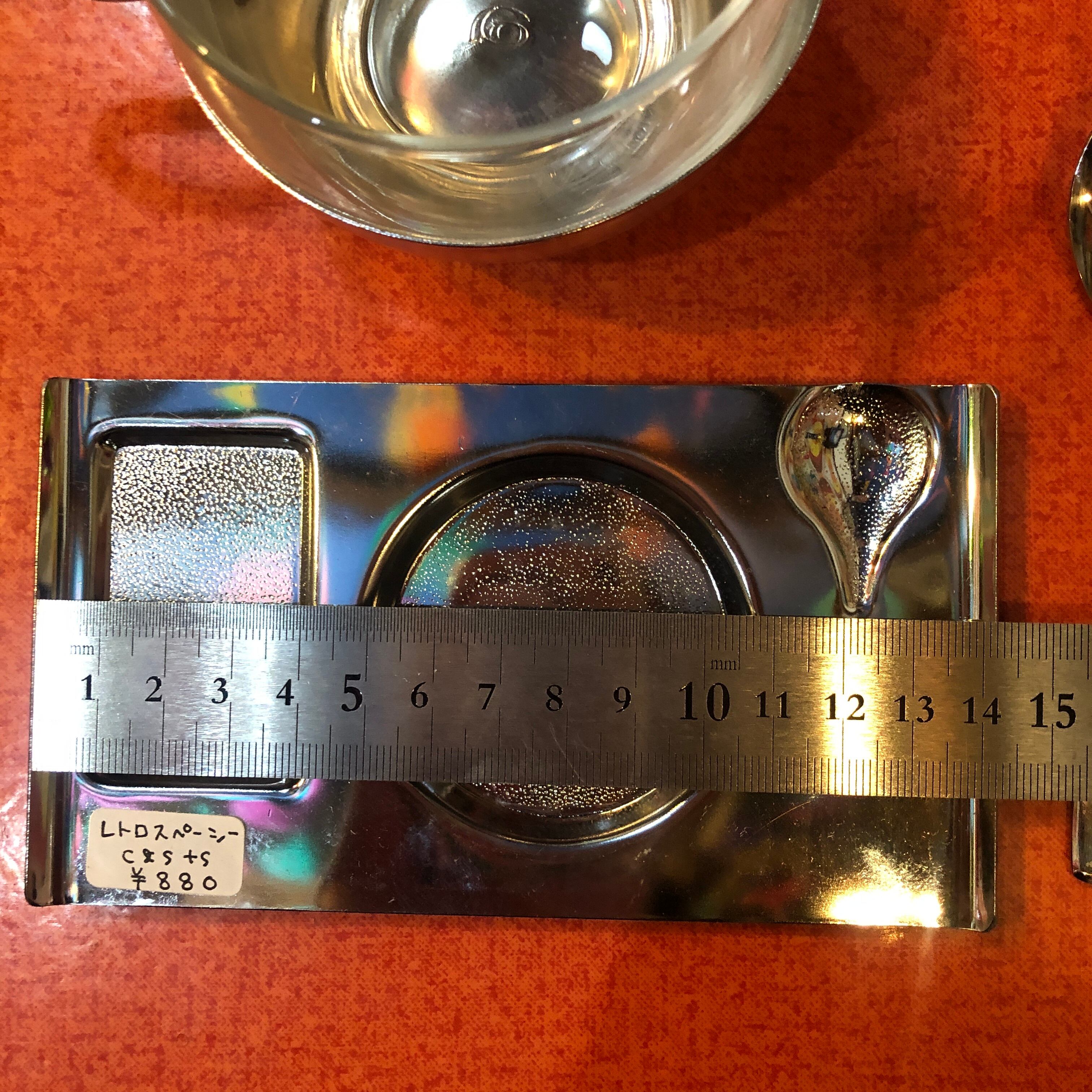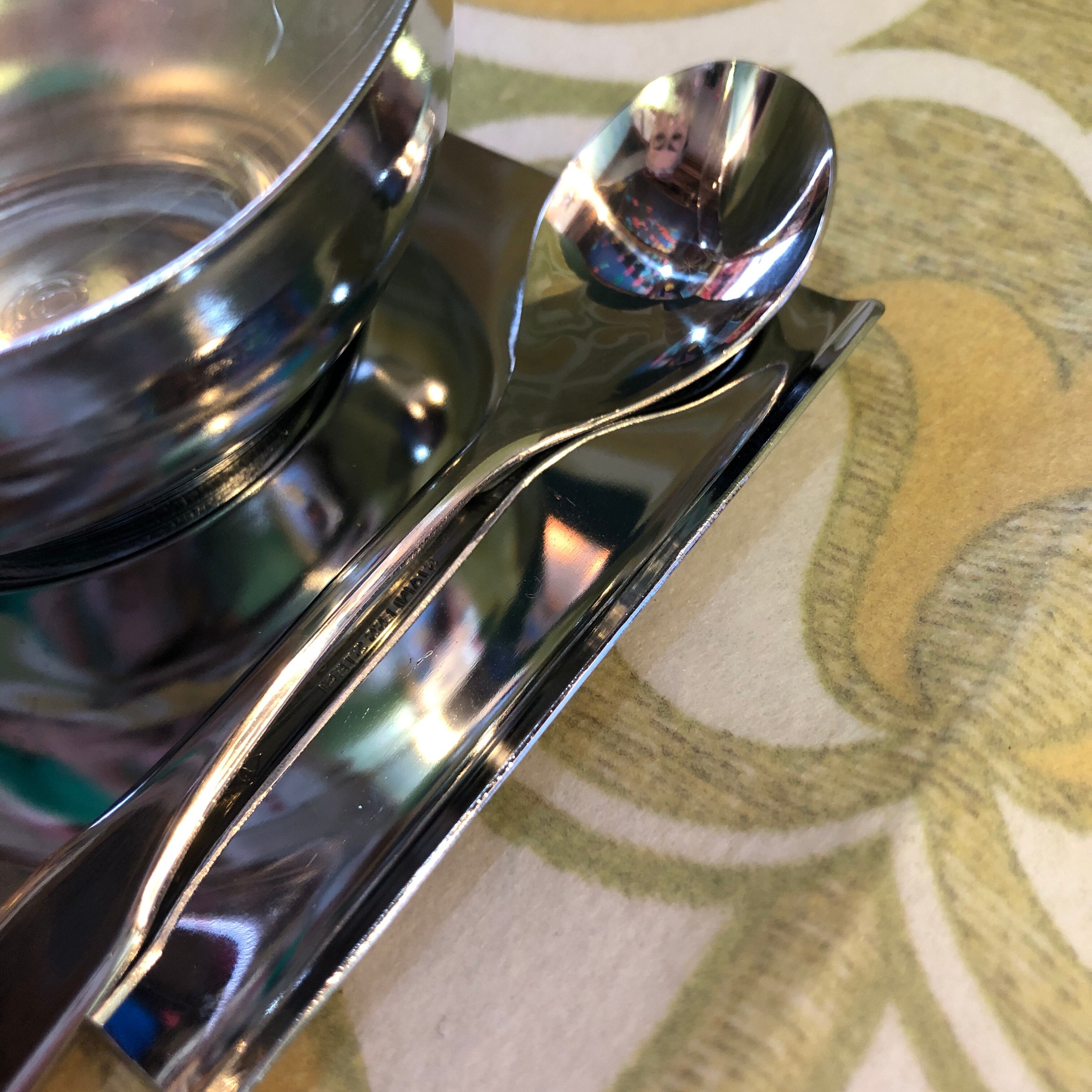 長方形のソーサーの右側には付属のスプーンがピッタリ収まる窪みと、左側には何をのせようかな?四角い窪みがあって、全てをセットするとこれまたレトロスペーシー☆